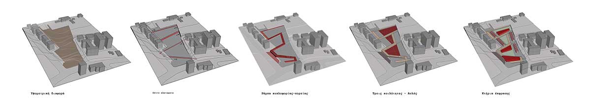 Κύριο στοιχείο της συνθετικής πρότασης, αποτελεί η ράμπα κυκλοφορίας, η οποία οργανώνει το χώρο και εισάγει σταδιακά το μαθητή και τον επισκέπτη από τον εξωτερικό,δημόσιο χώρο, στο σχολικό χώρο προσφέροντας του ποικίλα αισθητηριακά ερεθίσματα. Η ράμπα αυτή αποτελεί ταυτόχρονα ενοποιητικό στοιχείο για τις αυλές-πλατώματα-χώρους έκφρασης, αλλά και διαχωριστικό στοιχείο μεταξύ των αιθουσών διδασκαλίας και εργαστηρίων με τις αυλές.