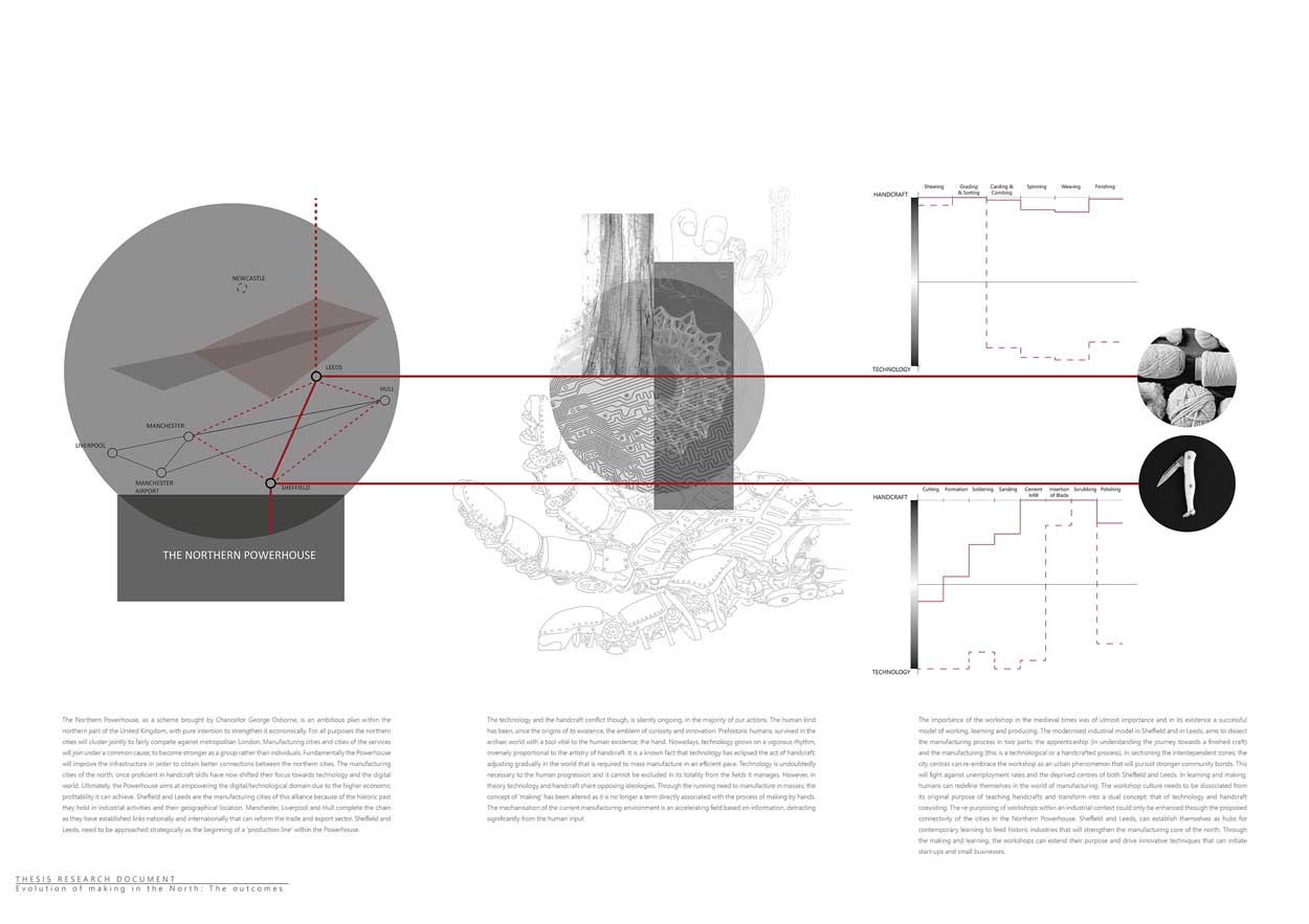 Η διπλωματική αυτή εργασία πραγματεύεται τη σύγκρουση της χειροτεχνίας και της τεχνολογίας στις βόρειες πόλεις της Αγγλίας καθώς στη πρόσφατη ιστορία τους ευημερούσαν στην τέχνη της χειροτεχνίας και σήμερα βαδίζουν στα μονοπάτια τεχνολογικών κατορθωμάτων σε ένα ψηφιακό κόσμο. Για την μελλοντική ανάπτυξη των πόλεων αυτών είναι σημαντικό να εκτιμηθεί κατά πόσο οι δυο αυτές φιλοσοφίες συνυπάρχουν στην ύπαρξη η στην εξάσκηση τους.