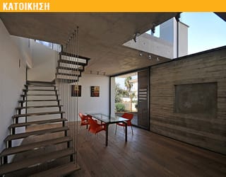 Στο ισόγειο, η κουζίνα αποτελεί τον πυρήνα για όλες τις δραστηριότητες, με τους υπόλοιπους χώρους να επικοινωνούν μεταξύ τους οπτικά. Η κεντρική είσοδος είναι τοποθετημένη βόρεια, παράλληλη με τον πεζόδρομο, ο οποίος συνεχίζει κατά μήκος του τεμαχίου. Η κύρια είσοδος εισάγει τον επισκέπτη μέσα στο διόροφο αίθριο.