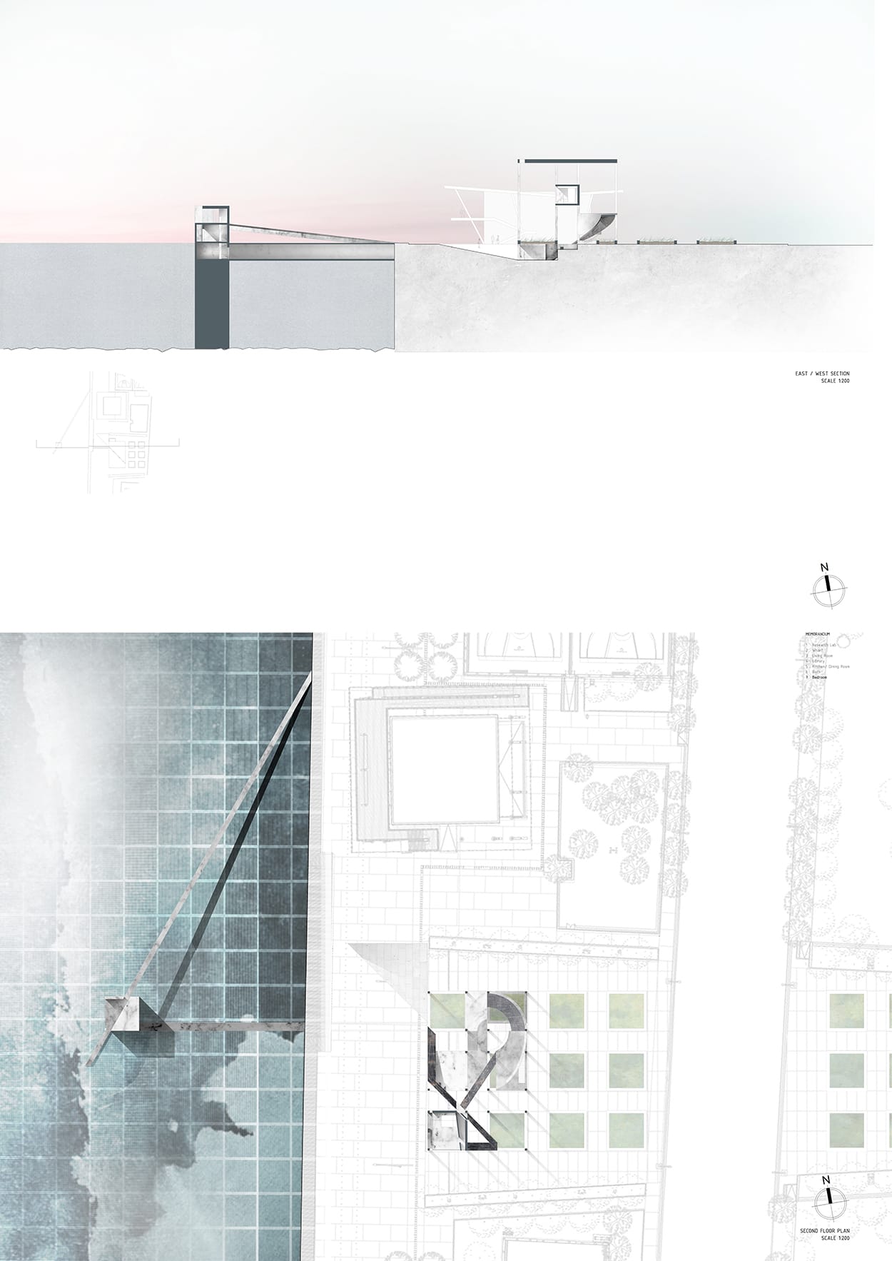 The approach of the building as associatively to Parthenon is upwards and at an angle so that the conception of the building geometries become more perceptible while introducing a ramp which starts from the edge of the promenade and reaches point of view, located in the sea (Image 3, Figure 1). The access of visitors stops at the point of view while the private individual continues to private spaces and foremost at home. The flow of public is being cut off, as to emphasize the ‘deadlock’, the nostalgia of the relationship, the sense of distance and yet, the only option is to return to the promenade. The user’s flow continues downwards with a spiral staircase that leads to an underwater point and then an underwater corridor for accessing the entrance of the residence (Image 3, Figure 2). This route is estimated to be 70 meters long and time-passing of the 2-minute normal pace. The time and desire are important factors for the appropriate reminder for survival and revival of the relationship.