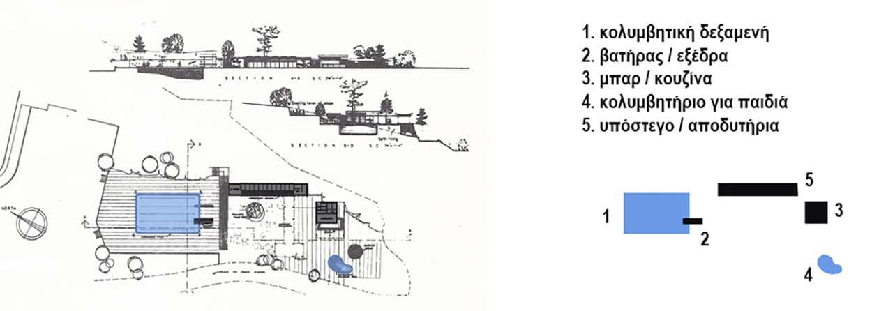 Ο Φώτης Κολακίδης έλαβε υπ’ όψιν, κατά το σχεδιασμό της πισίνας, την επιπεδότητα του εδάφους και την έλλειψη οποιασδήποτε αξιόλογης θέας. Η κολυμβητική δεξαμενή σχεδιάστηκε ως το κέντρο του ενδιαφέροντος και τα διάφορα βοηθητικά κτήρια χωροθετήθηκαν γύρω από αυτή. Στη μία πλευρά του έργου τοποθετήθηκε και ένα γήπεδο μίνι γκολφ.