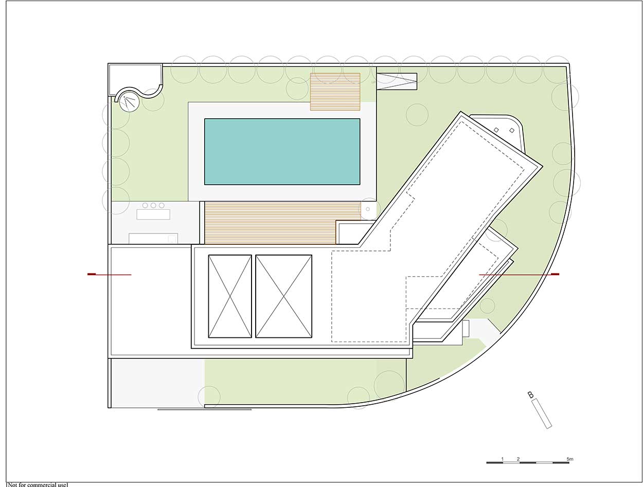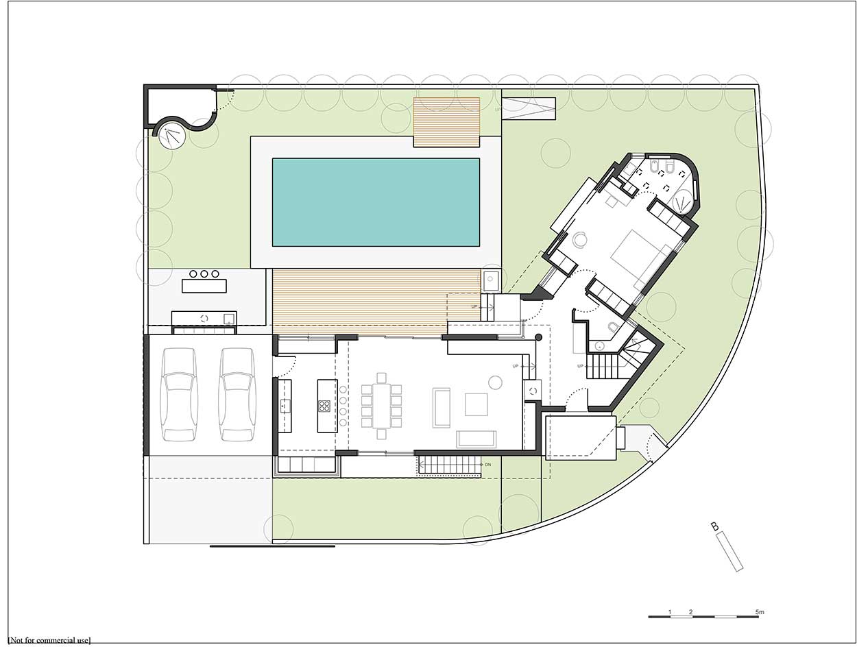 The requirements, as given by the clients, refer to an open plan space for the living room, dining room and kitchen, plus 3 bedrooms, space for bookshelves, a swimming pool and a basement for storage and mechanical purposes. The clients, who had the experience of living in a larger house but with a small garden, gave emphasis to their need for a garden but also of a house that would be easily maintained and where they would use all spaces daily.