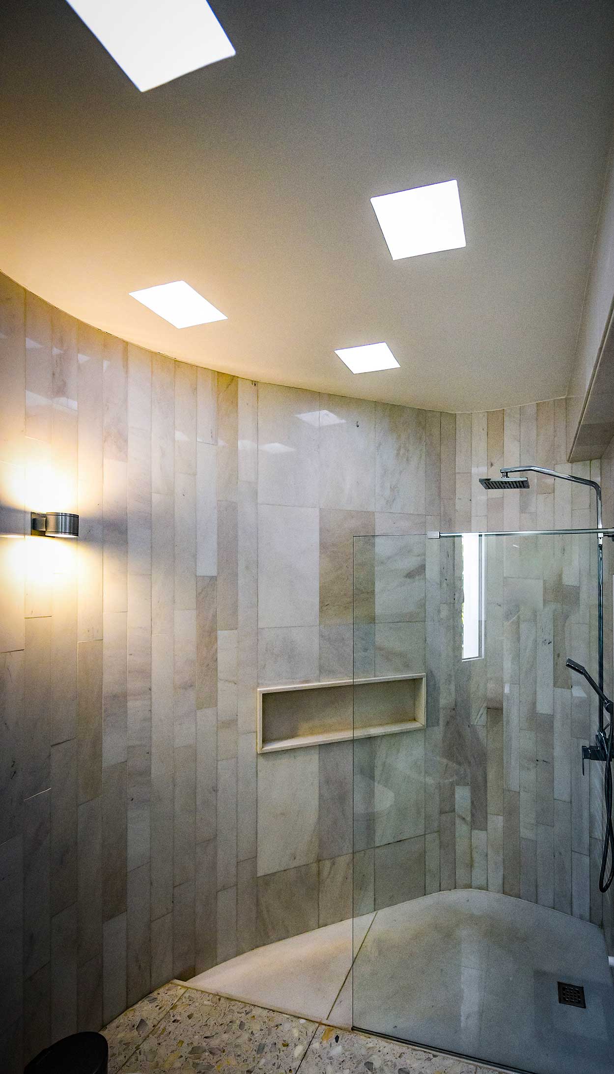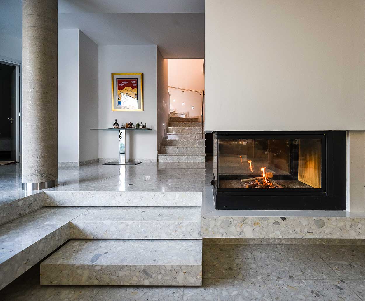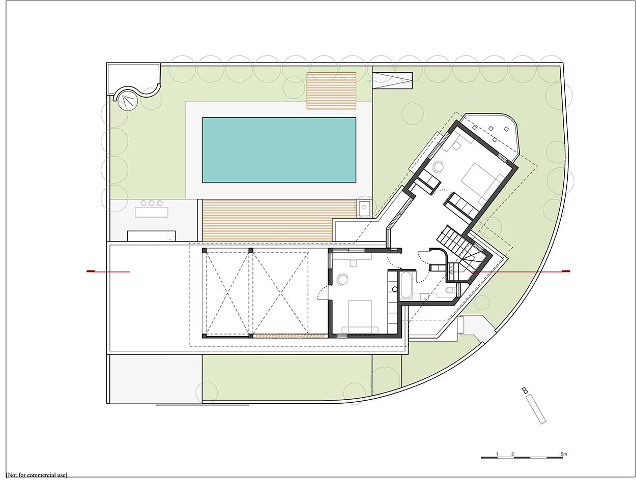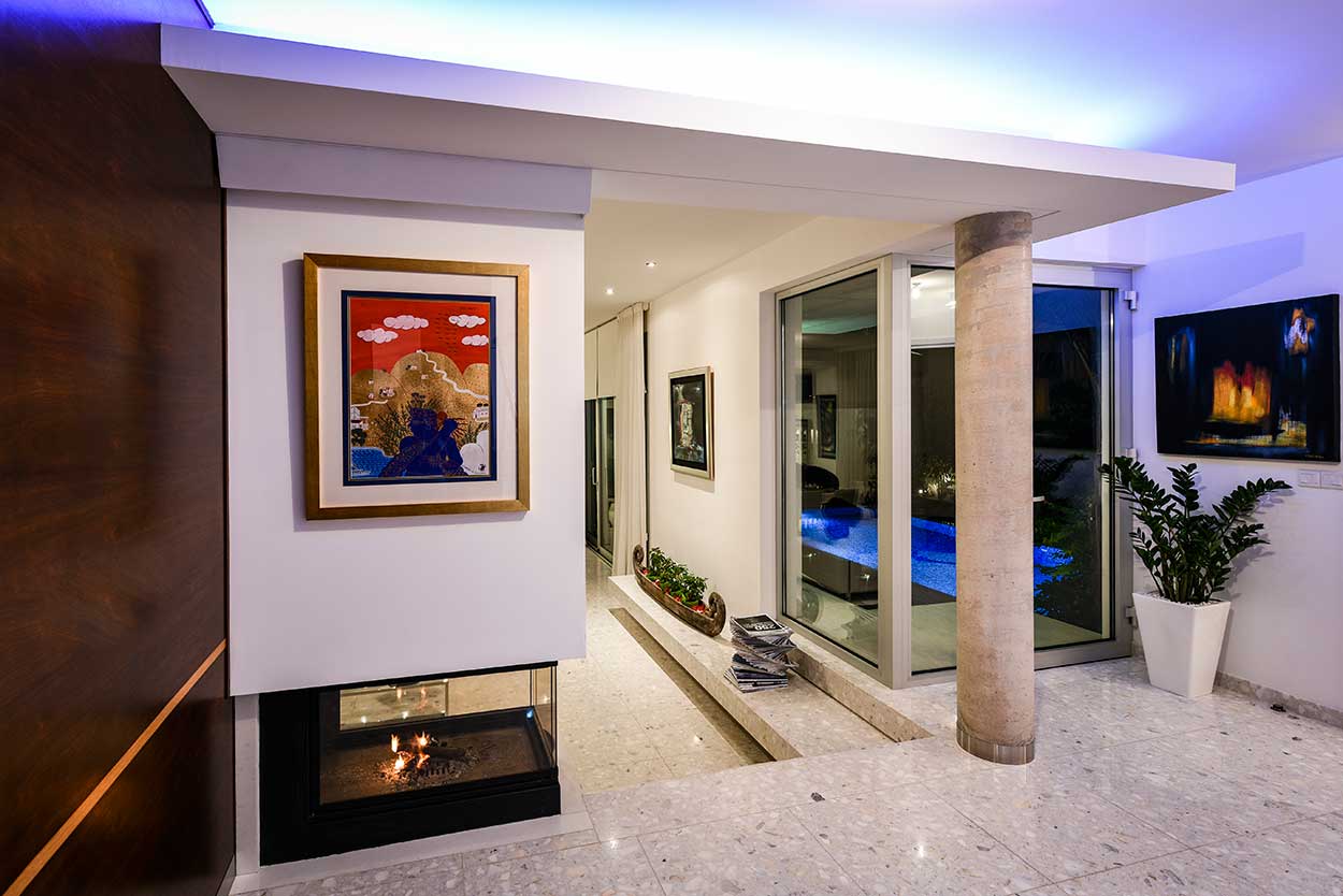 Despite the fact that the visual contact from the interior to the exterior could be presumed in an L-shaped building, in this case, there is also a conscious organization of the window openings so that one could constantly see outside as he/she moves throughout the different spaces or stands at specific spots i.e. the garden/pool is seen as soon as one steps into the entrance hall, as he/she comes up the stair to the 1st floor, while exiting the guests’ WC or standing in front of the basin in the master bedroom bath etc.