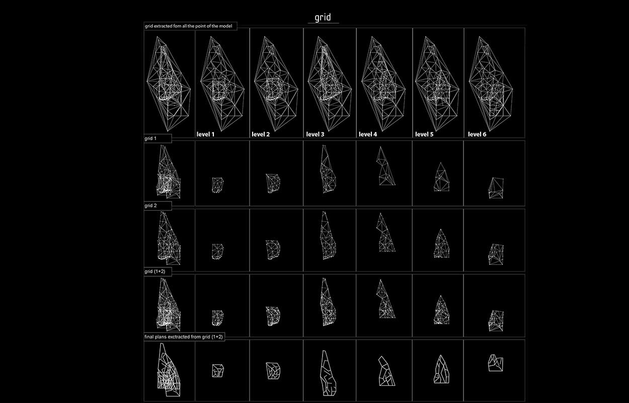 Ως αρχική ενέργεια για την εξαγωγή της μορφολογικής προσέγγισης του κελύφους, προσημειώθηκε η καμπυλότητα της επιφάνειας του βουνού με επίπεδες επιφάνειες. Ο κύριος λόγος για την επίτευξη της διαφοροποίησης της φυσικής πλατφόρμας* αποτέλεσε η ανάγκη του κελύφους γεωμετρικά να παραπέμπει στον αυτοσκοπό του, να εκφράζει δηλαδή το χαρακτήρα του ως ένα αντικείμενο στρατιωτικής φύσης εμπνευσμένο από τη γεωμετρία των αεροσκαφών stealth.