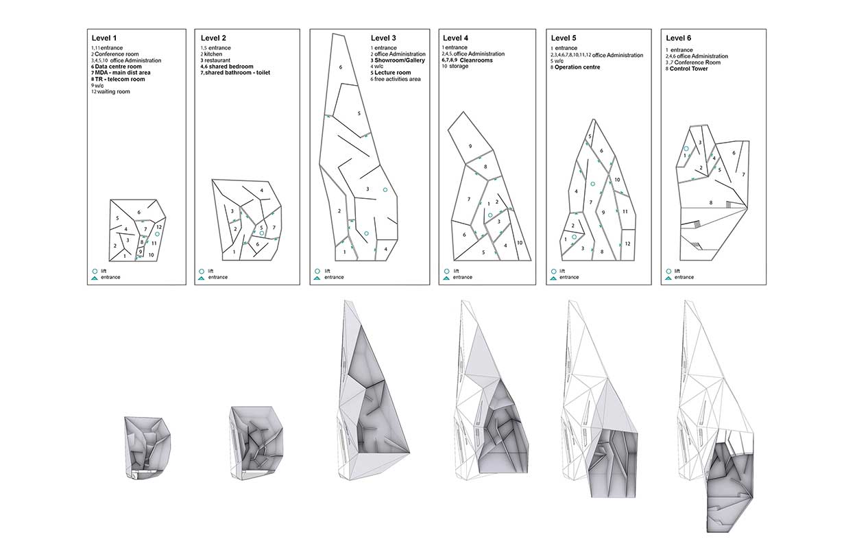 Το κέλυφος διαχωρίζεται σε έξι επίπεδα ,όπου το καθένα έχει το δικό του ξεχωριστό χαρακτήρα ανάλογα με τις υπηρεσίες που φιλοξενεί. Στο πρώτο επίπεδο βρίσκεται το δωμάτιο των υπεριπολογιστών (Data centre rooms) καθώς και κάποια γραφεία διοίκησης. Έχει άμεση επικοινωνία με το μηχανοστάσιο το οποίο είναι τοποθετημένο στο πίσω μέρος της ανεμογεννήτριας. Σαν χώρος, έχει μειωμένες ανάγκες φυσικού φωτισμού, σε αντίθεση όμως τις υψηλές απαιτήσεις εξαερισμού του. Το δεύτερο επίπεδο, αποτελεί ουσιαστικά το χώρο διαμονής του προσωπικού. Υπάρχουν κοινόχρηστα υπνοδωμάτια και μπάνια καθώς και χώρο εστίασης. Το τρίτο επίπεδο είναι το κυρίως επίπεδο, εκείνο που αποτελεί την επίσημη είσοδο για τους επισκέπτες. Στεγάζει ένα εκθεσιακό χώρο, καθώς και μια αίθουσα παρουσιάσεων. Στο επίπεδο τέσσερα βρίσκονται τα εργαστήρια επιστημονικών ερευνών , τα λεγόμενα cleanrooms. Τα cleanrooms αποτελούν ειδικές εγκαταστάσεις υψηλής τεχνολογίας , τα οποία πληρούν αυξημένες απαιτήσεις και προδιαγραφές ούτως ώστε να διατηρήσουν σε χαμηλά επίπεδα τους επιβλαβής ατμοσφαιρικούς ρύπους στο εσωτερικό τους. Το επίπεδο 5 αποτελεί τη μήτρα του κτηρίου, καθώς βρίσκεται η κεντρική μονάδα ελέγχου και διαχείρισης ολόκληρού του συστήματος. Στο τελευταίο επίπεδο, βρίσκεται ο πύργος ελέγχου εναέριας και θαλάσσιας κυκλοφορίας.