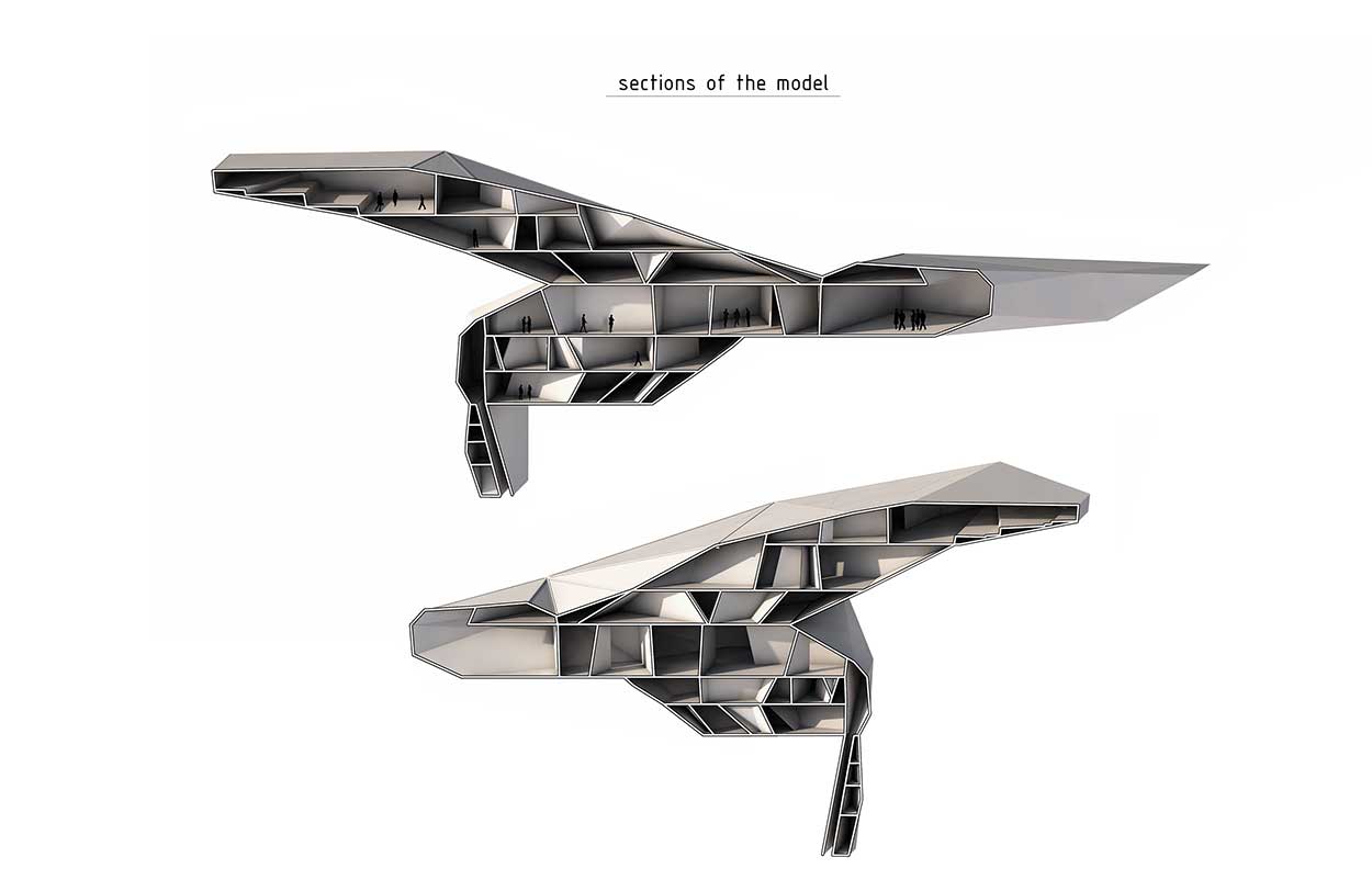 The model is divided on six parts; each one has its own individual character, rely on the services that provides. Inner areas are coated by Radar absorbent materials (RAM) on their whole. The latter constituted stipulations of layered materials and consisted of ferrite particles, being conscientious for the absorption of the electromagnetic radiation. Model’s inner complexion has being constructed by an unusual refractory metal which, as a consequence of its oxidized nature, visually appears under environment’s ocher, providing an astonishing effect to the whole synthesis. Model’s core consists of a metal truss, embedded into the ground by columns that are constructed by reinforced concrete.