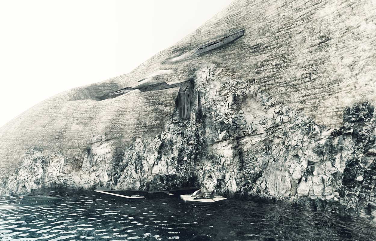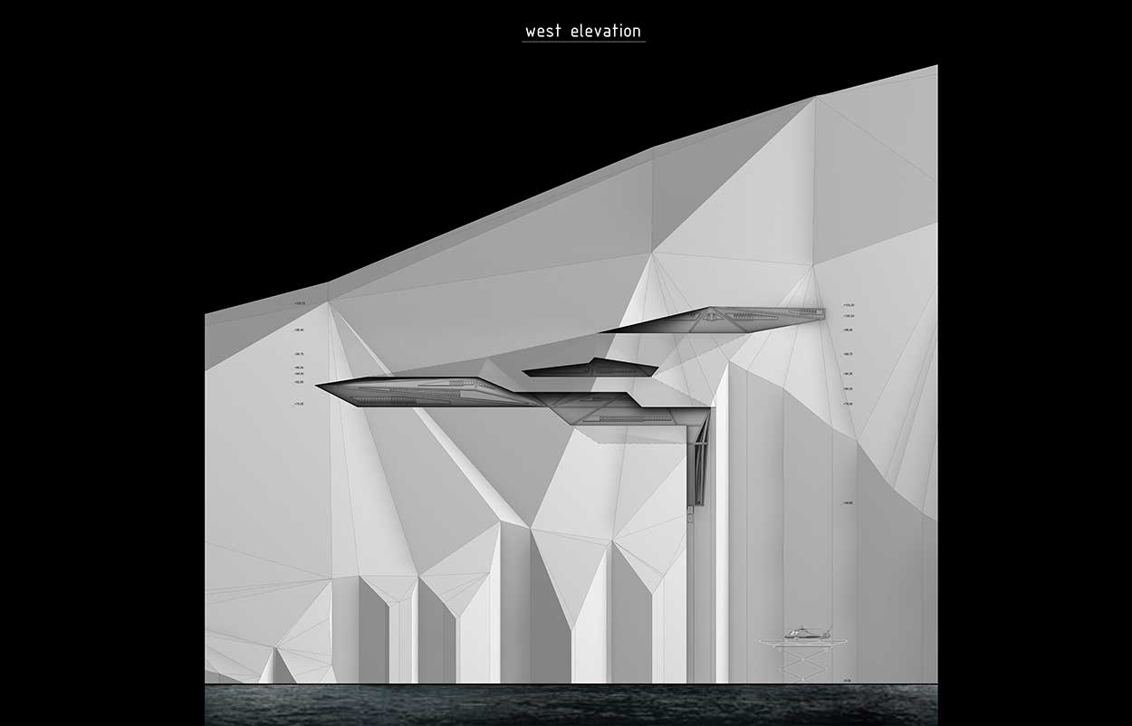 The model was constructed at islet’s West side, since at this point as a consequence of the mountains’ altitudinal inequality, a rigorous shadow phenomenon is formed that obstructs its detection by ordinary satellite shots. Simultaneously, the particular spot is energy profitable, due to strong winds that function as electricity supply’ source, enabling the construction to be energy independent. Being the main energy source for the export of the morphological approach of the model, the curvature of the mountain’s surface was simulated with flat surfaces. The main reason for the success of the platform’s design differentiation, was the model’s need to geometric refer in its own sake, to express its character as a military object inspired by the geometry of the Stealth aircrafts.