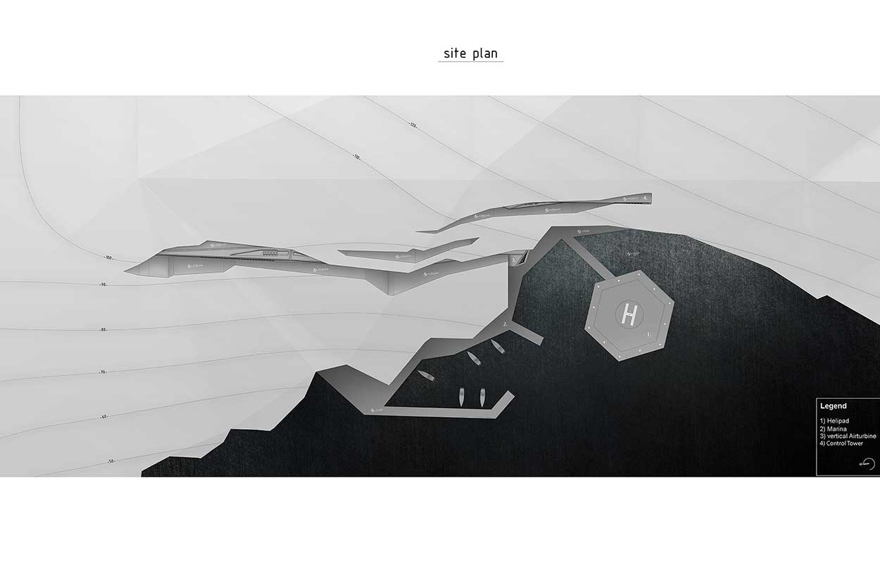 Access to the area has been accomplished by the construction not only of a tiny Marina but also of an hydraulic retractable heliport platform. Regarding to the floorplan’s design, there are have been followed some grids that have been extracted from points of the model itself. Hence, complicated places (choroi) having both the form and the logic of a labyrinth, were formed. Such a similar thought applies to its vertical motion, in the same way that the elevators’ switch required (per floor). Its major target has been navigation difficulty level’s increase, designed for protecting its units. This strategy’ scope that functioned as a system of security management has also been appeared in antiquity. It can be recognized in the complexity of urban networks during island’s migration, resembling an artful move for being protected by pirates’ attacks. Additionally, it is testified through historical works of Thucydides, being confirmed by the Theban attack against Plataean.