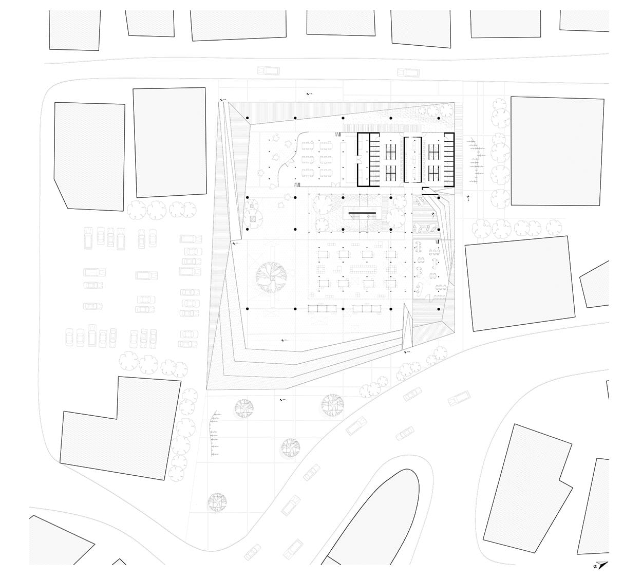 Το κτήριο διαχωρίζεται σε ζώνες ιδιωτικής και δημόσιας ζωής μέσω διαφορετικών επιπέδων. Στο ισόγειο προσφέρονται χώροι δημόσιου χαρακτήρα (συλλογική κουζίνα, χώροι συνάθροισης ,βοηθητικοί χώροι) που πλαισιώνουν την δημόσια, ανοιχτή πλατεία. Η ελεύθερη ροή και κατακόρυφη κυκλοφορία προς τα επίπεδα ιδιωτικής ζωής οργανώνεται μέσω διαδρόμων και ραμπών που βρίσκονται κεντροβαρικά στη σύνθεση. Οι χώροι διημέρευσης οργανώνονται σε αυτόνομες μονάδες σε διακριτές γειτονιές «κάτω από την ίδια στέγη», δημιουργώντας την αίσθηση ενός ενοποιημένου κτιρίου. Η επιλογή του οικοπέδου έγινε στρατηγικά με σκοπό την αναζωογόνηση του εμπορικού δρόμου της οδού Θεμιστοκλή Δέρβη.
