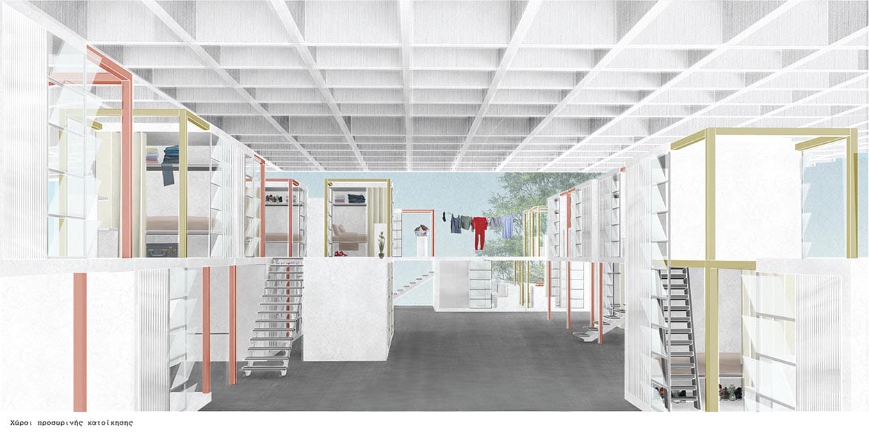 The project suggests the creation of a temporary housing infrastructure that works in corporation with an open multipurpose square, both sheltered by a common roof. The idea deals with the social problem of economic crisis and unemployment and refers mainly to young people providing them a short-term accommodation while giving them the chance to organize outdoor workshops and markets to exhibit or sale their work. The project could be considered as a social experiment since it proposes an alternative way of housing that pushes the limits of privacy and periodic habitation.