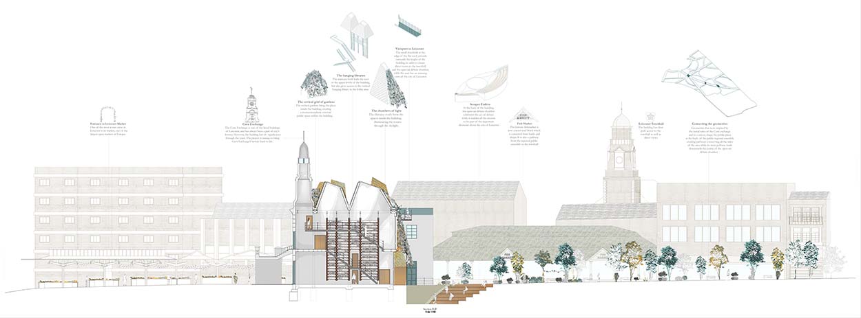 Placed at the site of the Corn Exchange, the building is surrounded by the most vital interaction places of the city; the Leicester marketplace and the town hall. It will create new noticeable links between the town hall square and the marketplace forming a new democratic public square.Markets are considered to be one of the most crucial public spaces among a city. Leicester Market is an important connection point creating unforced interaction for the highly diverse community.