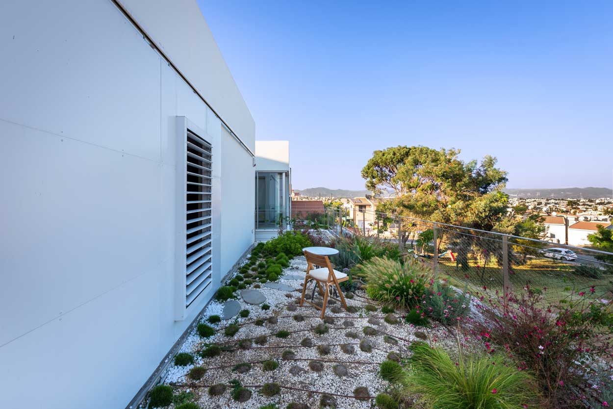 Η οικία ανεγέρθηκε στο σχεδόν μισό οικόπεδο ενώ το υπόλοιπο διατηρήθηκε ως κήπος, που ποτίζεται με σύστημα άρδευσης που τροφοδοτείται από γεώτρηση, ώστε να ελαχιστοποιούνται οι επιπτώσεις στους περιορισμένους υδάτινους πόρους του τόπου. Ζητούμενο από την αρχή ήταν η φύτευση με ξηρανθεκτικα είδη, κατάλληλα στις νέες διαμορφωμένες κλιματικές απαιτήσεις της Λευκωσίας, που να συνάδουν με το κυπριακό τοπίο, ώστε να ενθαρρύνεται η ανάπτυξη ενός φυσικού περιβάλλοντος φιλικού προς τα είδη που παρατηρούνται στις πόλεις, όπως τα πουλιά και οι μέλισσες που συμβάλλουν σημαντικά στη διατήρηση της βιοποικιλότητας και της γεωργικής παράγωγης.