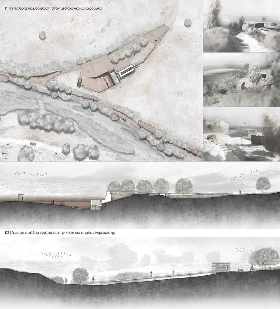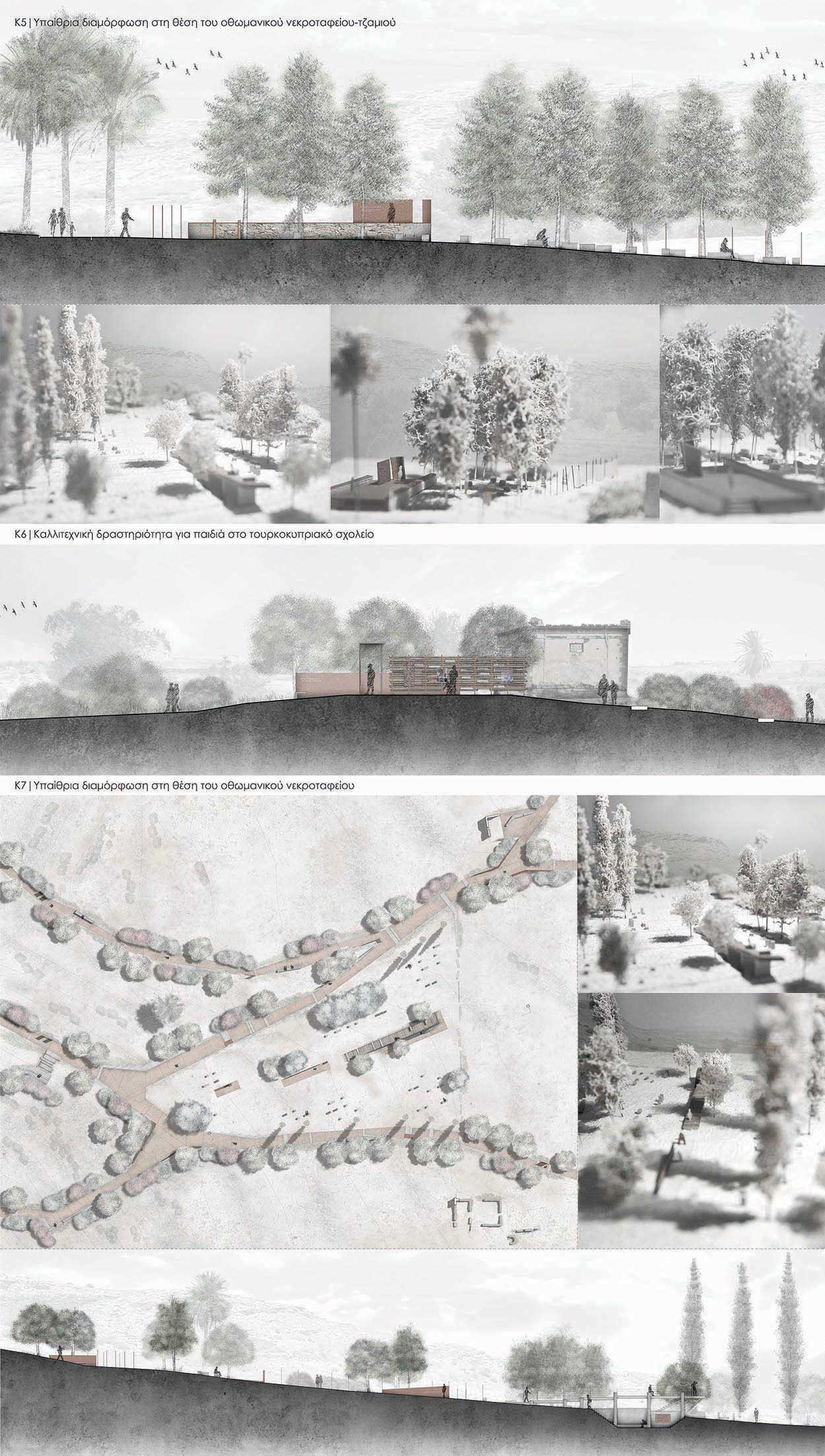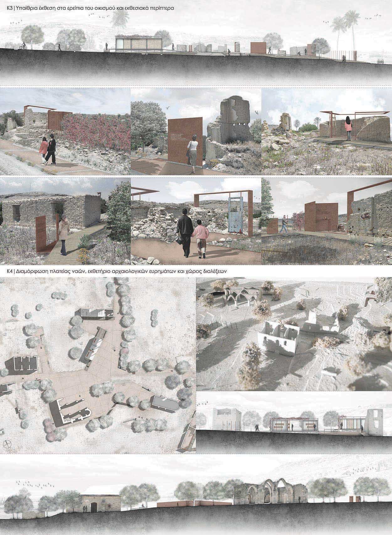 Due to the above-mentioned circumstances, landscape interventions are proposed at the landmarks of the settlement, aiming to reveal the various historical periods and the collective memory of the residents without interrupting the natural environment and the ruins but by being integrated into them. Those small hubs form part of a cultural pedestrian route enriched with exhibits and complemented by vegetation and a few pavilions. The interventions are inspired in the land art and the romantic ruin aesthetics and they are perceived as “spolia” which are composed in order to reactivate the memory, offering the visitor a sensory experience and knowledge of the site.